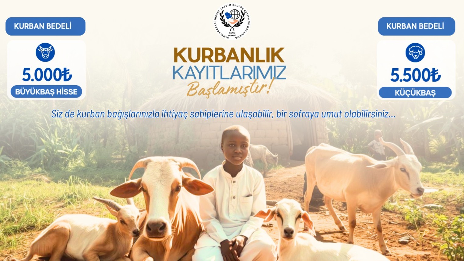 "Kurban bağışlarınızla ihtiyaç sahiplerine umut olabilirsiniz. Küçükbaş kurban bedeli 5.500 TL, büyükbaş hisse bedeli ise 5.000 TL’dir. Bağışlarınız güvenle kesilerek gerçek ihtiyaç sahiplerine ulaştırılır ve sizlere bilgilendirme sağlanır. Paylaştıkça çoğalan berekete siz de ortak olun."